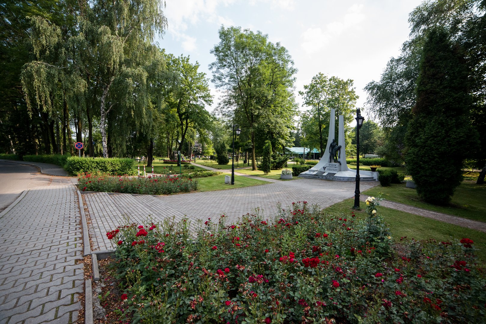 W parku znajduje się także pomnik „Ofiarom hitleryzmu”. Pod koniec drugiej wojny światowej Niemcy zmusili więźniów obozu Auschwitz–Birkenau do morderczego marszu na zachód. Nazwali to ewakuacją. Szlak gehenny prowadził przez okolice Strumienia. Mnóstwo więźniów padło z wyczerpania. Życie tracili w przydrożnych rowach. Pomnik wzniesiono na skraju parku, niespełna 20 lat po wojnie. Przedstawia dwóch więźniów. Konającego podtrzymuje towarzysz, którego zaciśnięta pięść symbolizuje bunt oraz niezłomną walkę. A z tyłu widzimy dwa białe, stylizowane kominy krematoriów.