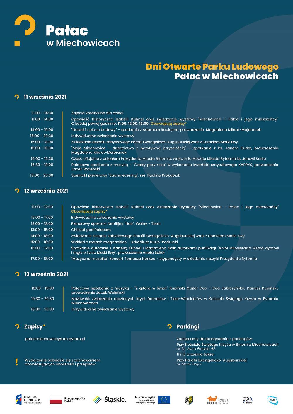 W niedzielę Pałac przy ul. Dzierżonia 21 otworzy swoje drzwi dla zwiedzających o 11.00. Tego dnia w programie znajdzie się między innymi spektakl familijny „Noe” w reżyserii i wykonaniu Adama Walnego, wykład Arkadiusza Kuzio-Podruckiego o rodach magnackich, spotkanie autorskie z Izabellą Kühnel i Magdaleną Goik, autorkami publikacji „Anioł Miłosierdzia wśród dymów i mgły. O życiu Matki Ewy” oraz koncert Tomasza Herisza „Muzyczna mozaika”. Goście odwiedzający Pałac w Miechowicach będą mieli możliwość wzięcia udziału w kolejnym koncercie, wystawie oraz zwiedzaniu rodzinnych krypt Domesów i Tiele-Wincklerów także w poniedziałek, 13 września od godz. 18.00.