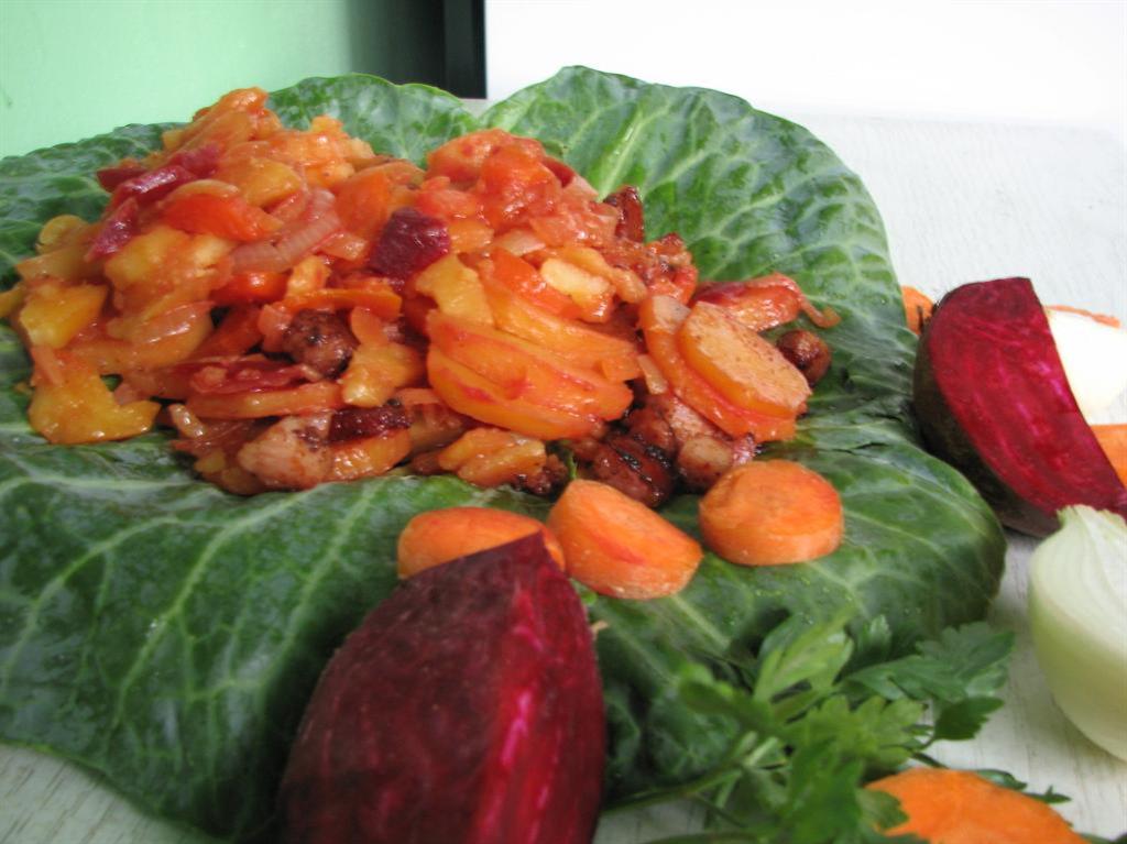 Wygląd na przekroju to ułożone warstwowo ziemniaki pokrojone w kostkę, cebula pokrojona w krążki, kiełbasa pokrojona w talarki, boczek pokrojony w kostkę, na wierzchu liście kapusty